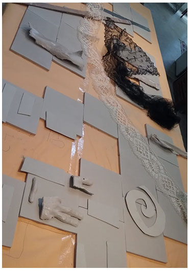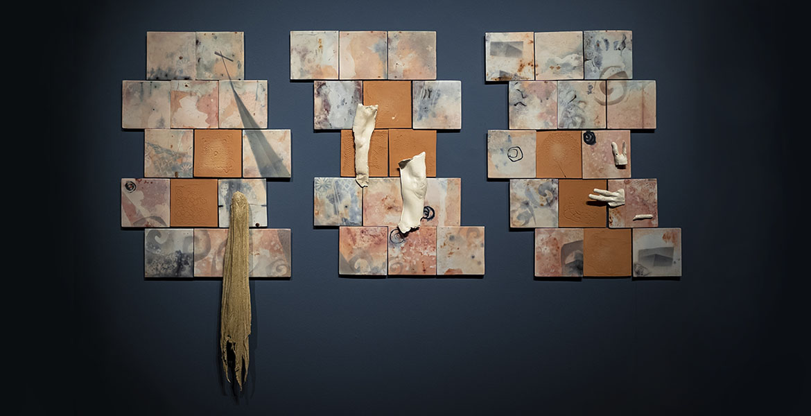 Cerâmica de baixa temperatura, com aplicação de terra sigillata, queima primitiva em forno a lenha. Três painéis com aprox. 75 x 60cm cada.